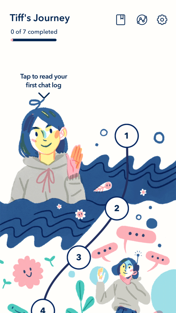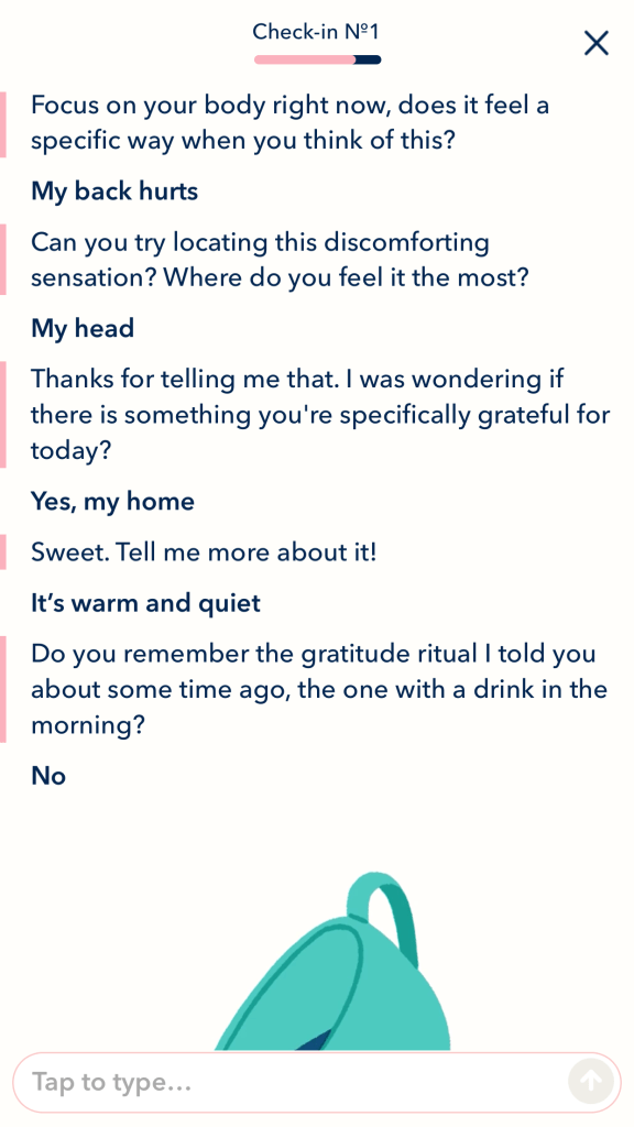 Sayana is your AI therapist. The whole app is set up to make you feel calm and at ease, from the drawings to the sweet tinkling music. In the free version, each day you log in and talk to Sayana. She’s programmed to talk to you like a real therapist.